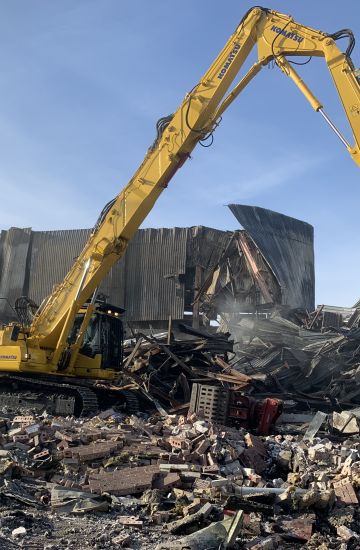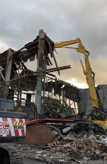 We were called out within hours of the fire happening to help the fire brigade reach the fire hot spots, mobilising machines (30t, 40t and 60t high reach). removing all cladding and working our way in while the fire brigade put the fire out. Once the fire was out we were tasked with demolishing the 15000m2 fire-damaged buildings down to slab level including all waste materials inside.
